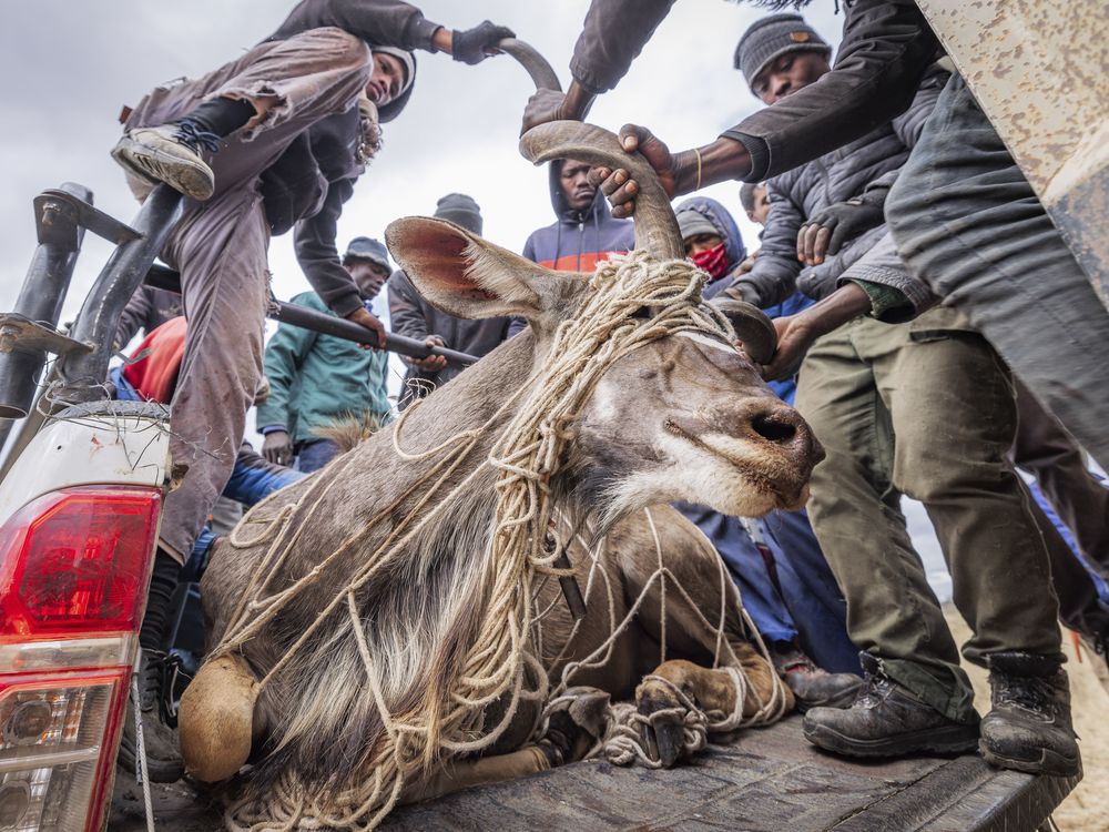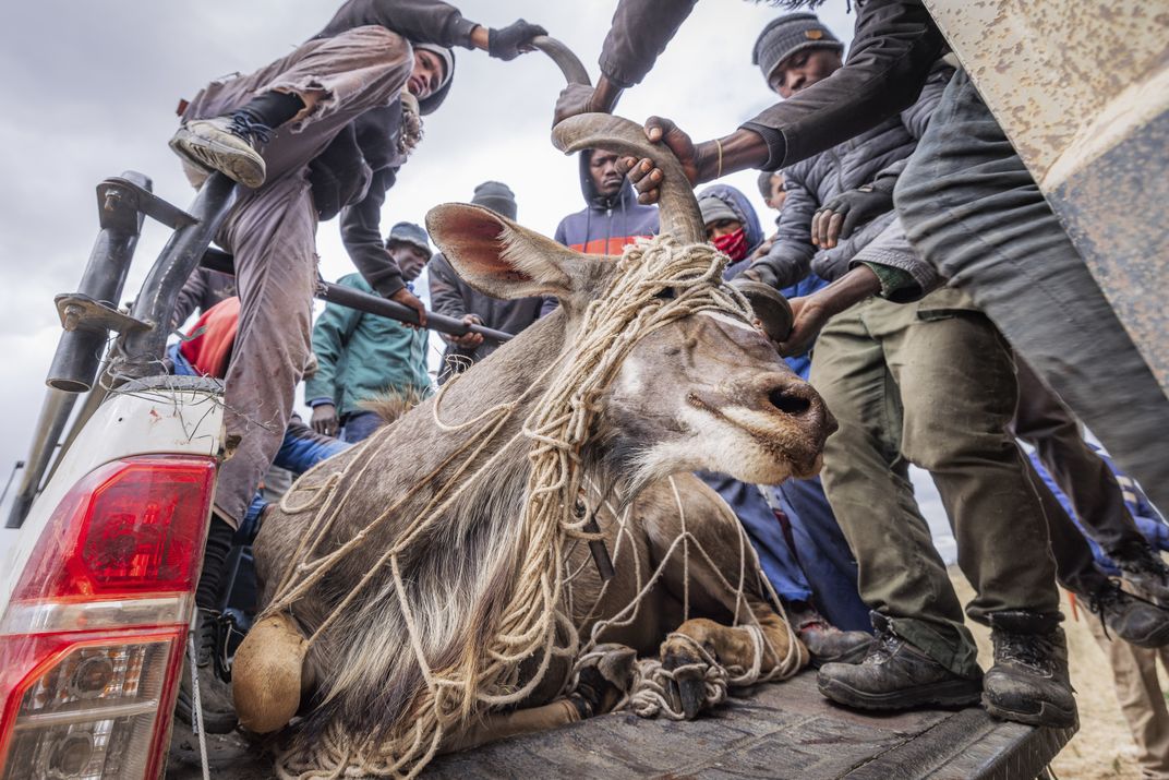 During a game capture in South Africa’s Northern Cape, a kudu is restrained after being netted for translocation. In fenced reserves without predators, managers move animals to balance numbers, prevent overgrazing, and maintain genetic diversity through this demanding work.