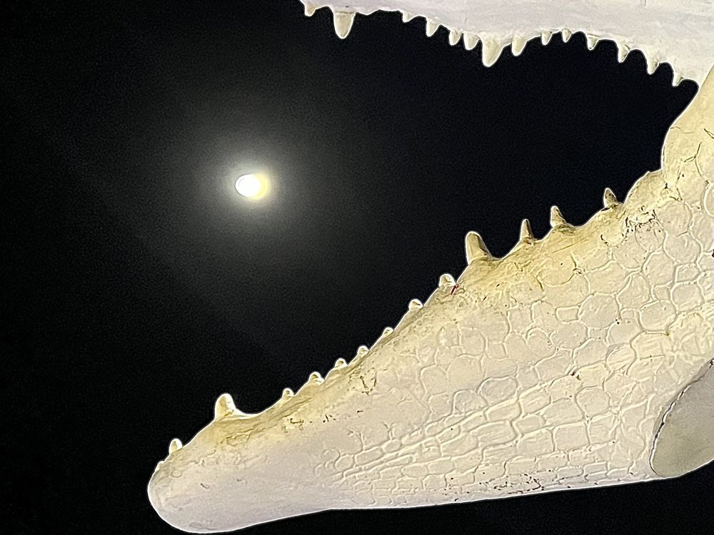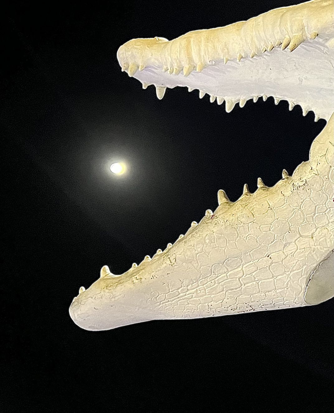 The caiman, a large figure on the Malecon in Barranquilla, Colombia, in the foreground. In the distance, the moon beginning the night.