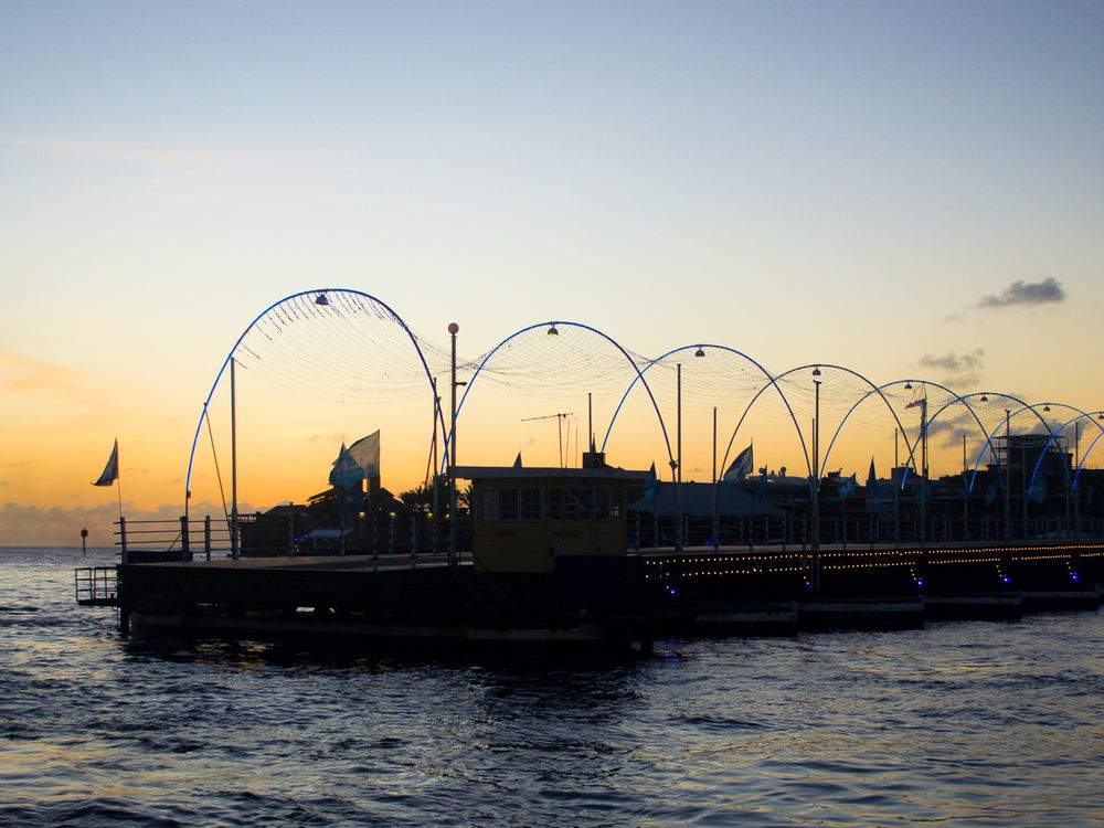 The Queen Emma floating pontoon bridge is lit up with Christmas lights and stands out against an incredible Willemstad sunset.