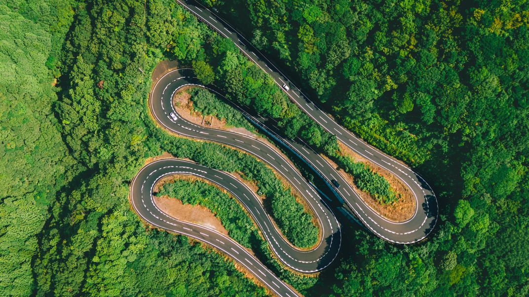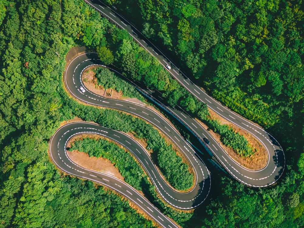 An aerial view of a serpentine road snaking through a dense, green forest. White lane markers guide vehicles along the curvy path, offering a scenic journey amidst nature.