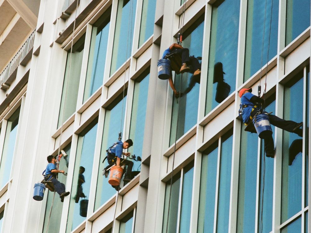 Four men wash the windows of M&T Bank Stadium in Baltimore, Maryland; home of the Baltimore Ravens.