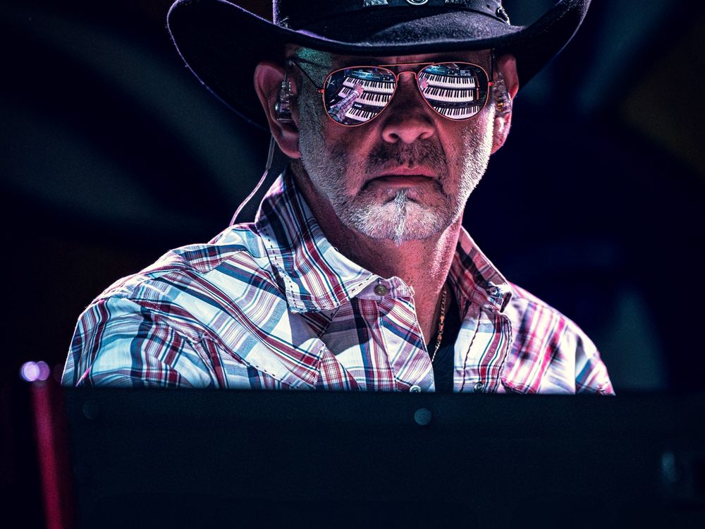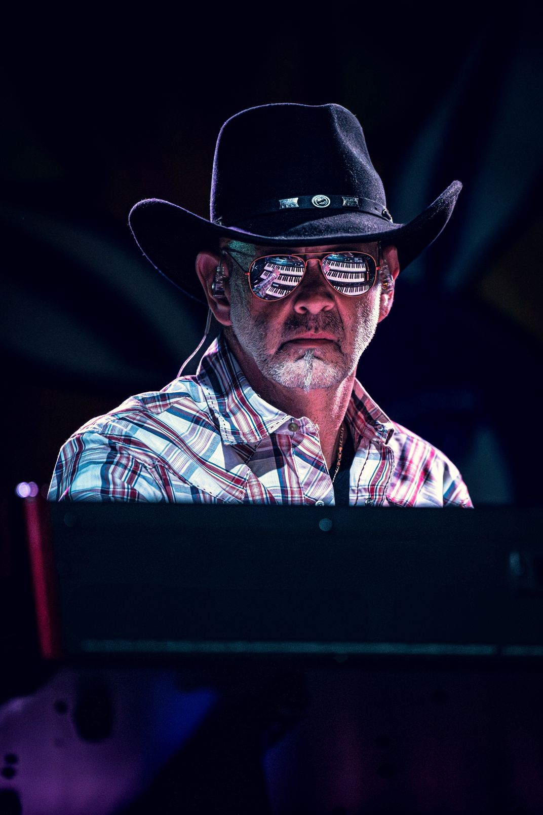 A keyboard player at the Jacksonville County Fair in 2024 looked up at the exact right moment, revealing the reflection of his 3 keyboards in his sunglasses!
