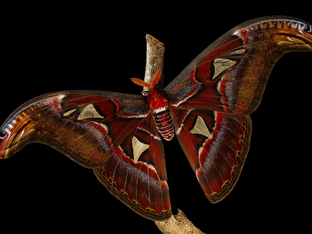The Atlas moth (Attacus atlas), one of the largest moths in the world, is known for its astonishing wing patterns that resemble the heads of snakes — a natural defence strategy against predators. This photograph was captured with precise lighting to emphasize the intricate textures and subtle colour transitions across its vast wings.
