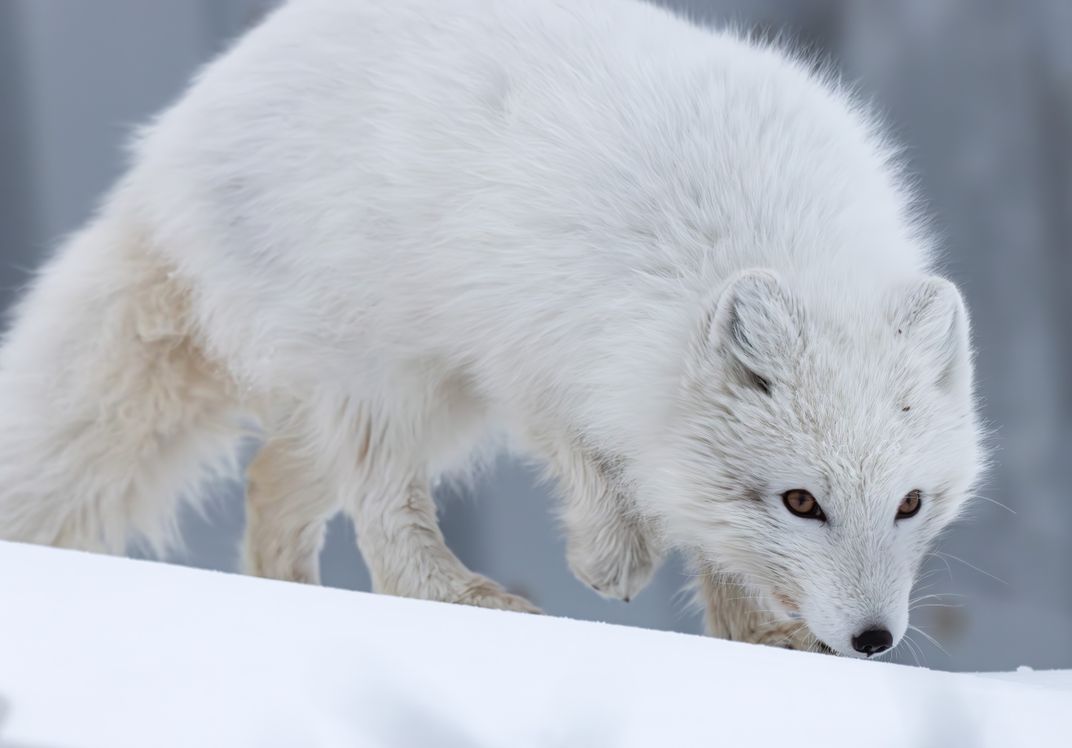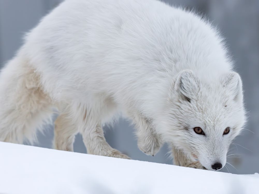 An Arctic fox walks slowly over the snow-covered ground in Churchill, Manitoba, Canada, its nose low to the ground. The fox’s white coat blends into its snowy surroundings. Unlike other canids, an Arctic fox’s coat changes color seasonally, from brown or gray in the summer to snow white in the winter. Photographed in 2025.