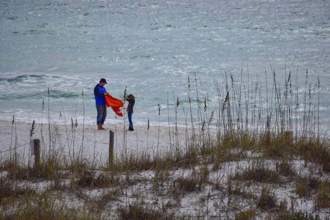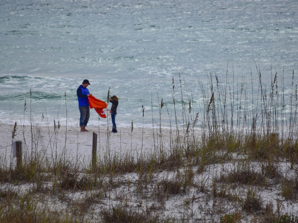 A father and child gather their things on a chilly New Year's Eve Day on the unspoiled beach at St. Andrews State Park near Panama City Beach Florida. The father is trying fold up a something red but it blows in the wind like a flag. There grass on the natural sand dunes just a short distance from high rise hotels and condominiums just outside the park boundary