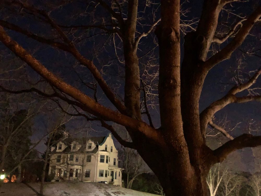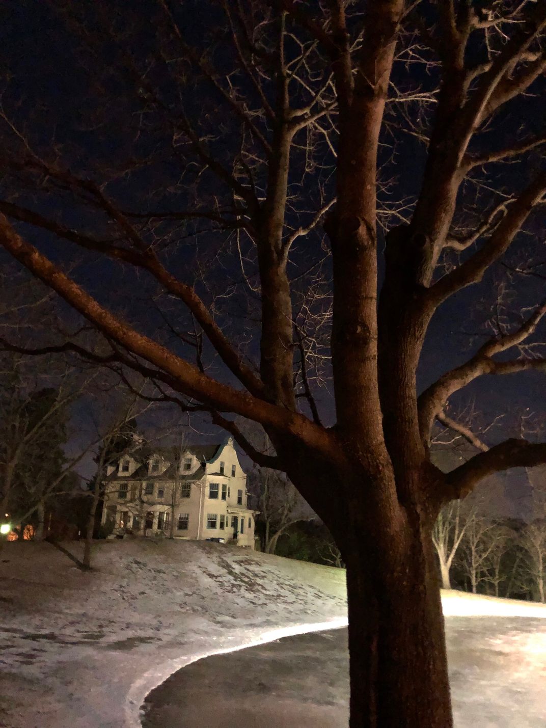 house near a pond with a tree on a winter night