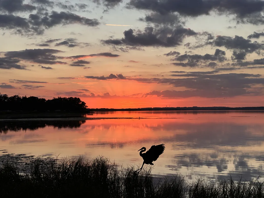 During a recent glorious sunset in a Heron landed in in Lake Apopka.