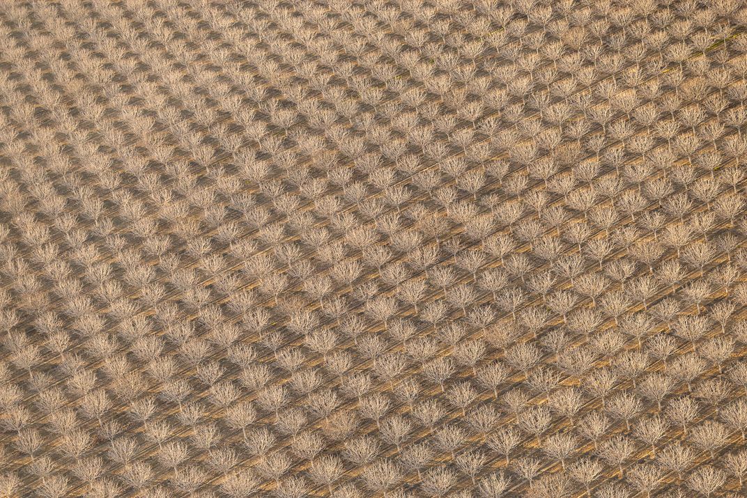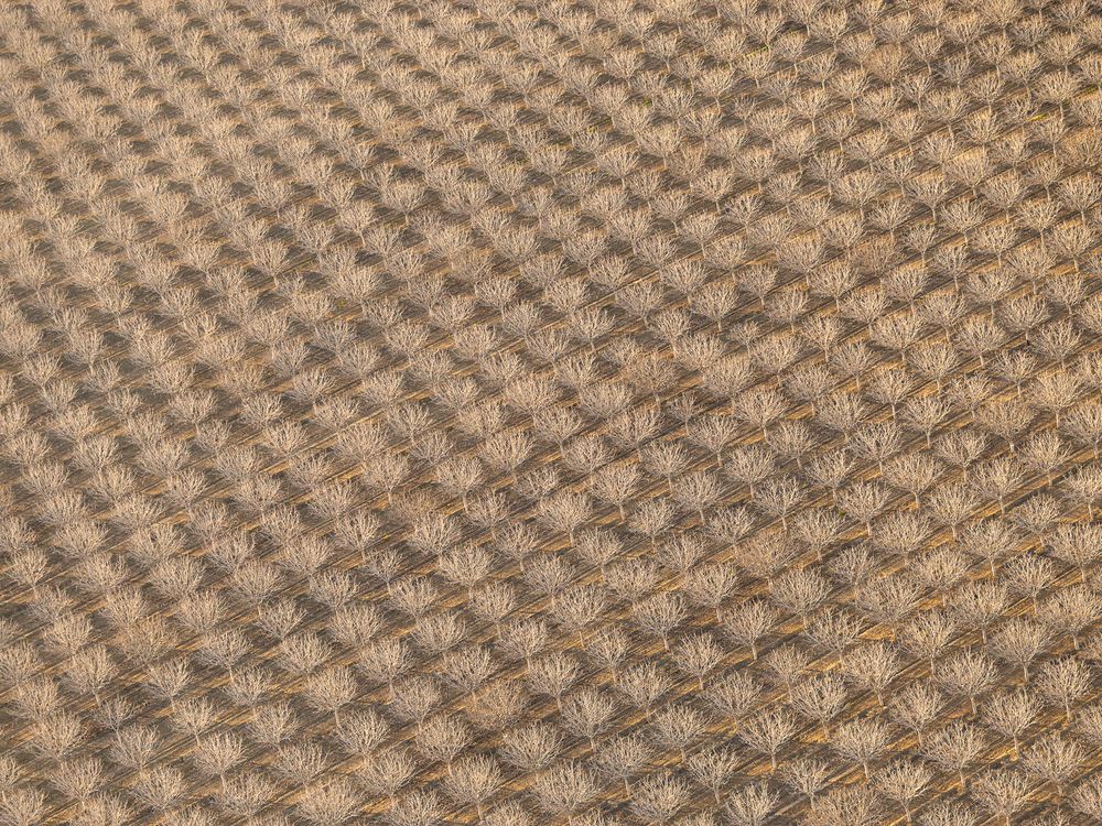 Seen from above, a dormant orchard becomes a field of repeating forms — thousands of bare trees casting long, identical shadows across the soil. Stripped of leaves, the branches reveal a perfect grid shaped by human design, turning farmland into an abstract pattern of lines and lattices. In winter’s light, agriculture reads like geometry.