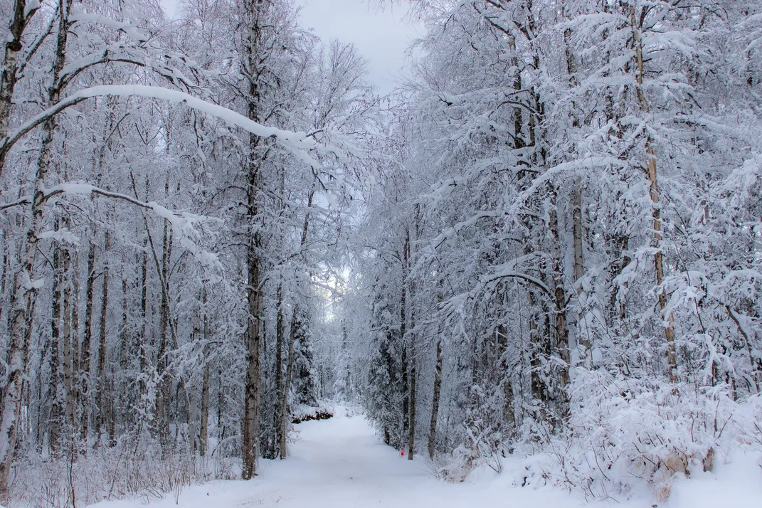 24 hours in Willow, AK a magical place in a secluded area. This photo is taken in a mountain showing the beauty of a snowy trees.