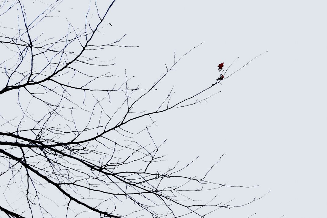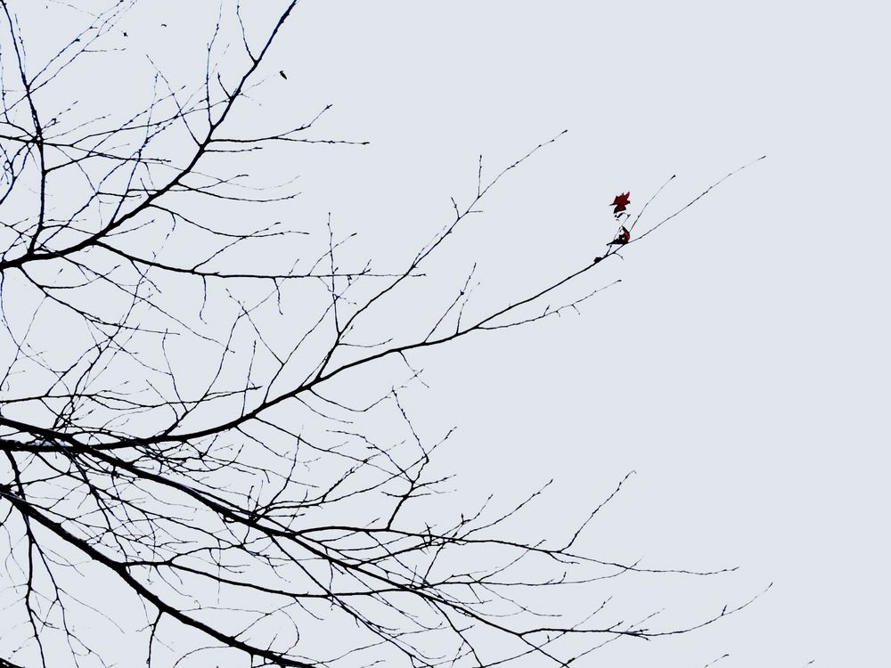 Captured during a winter journey in Japan, this scene reminded me of a traditional ink wash painting. Against the stark white canvas of the sky, the bare branches form a silhouette, holding onto the last crimson leaf—a symbol of resilience.