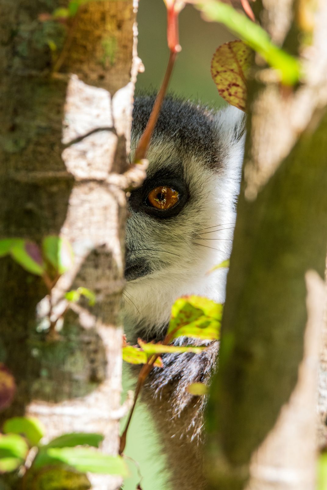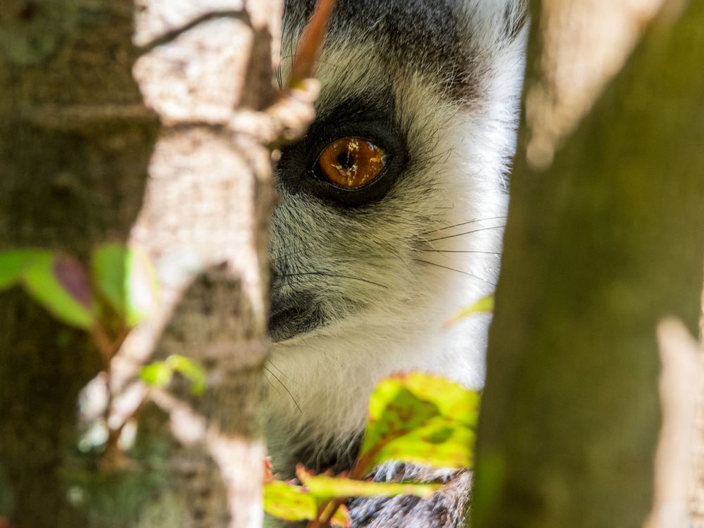 A Ring-tailed lemur looking through the branches of a tree and directly into the lens at Saiadi botanical garden north of Tolagnaro (Fort Dauphin).