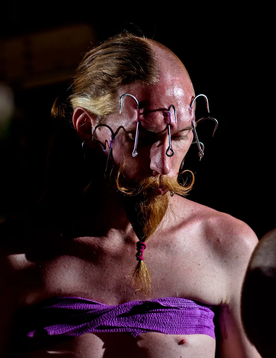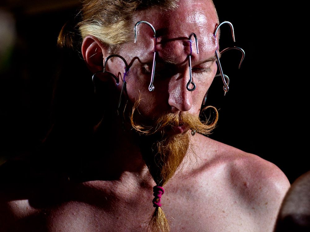 With seven hooks piercing his face, Andrew Stanton prepares to be suspended from them at the 2011 Dallas Suspension Convention.