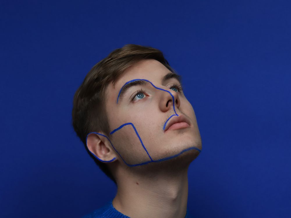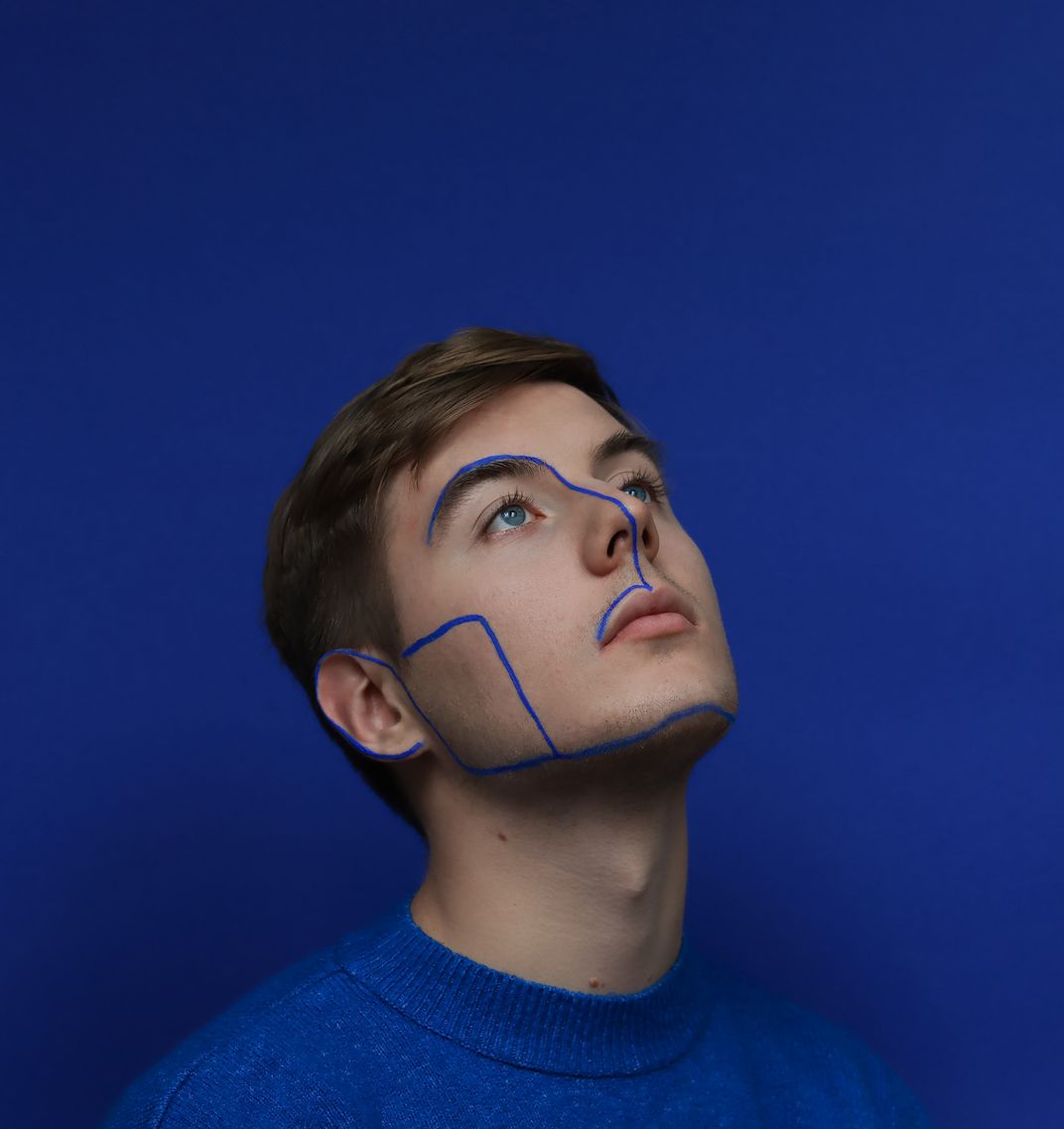 Whole series presents my friends with whom we wanted to feel the modeling and professional photography vibe This is the first photo in a series of graphic-makeup portraits. In the photograph you can see my good friend Wodnik. I wanted to capture his delicate nature and emphasize beautiful color of his eyes. The lines drawn on the face point out his features.