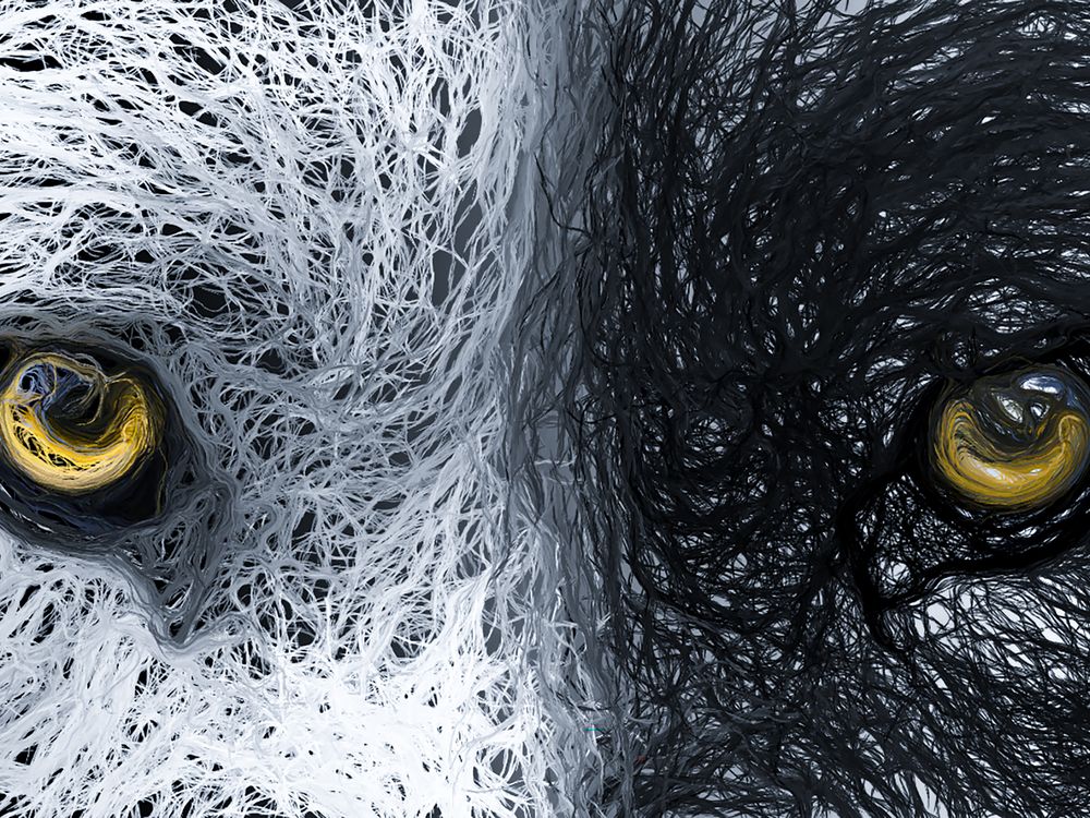 Here is made from one of my original wolf photos, I found a style that use the historic paintbrush in photoshop with the good texture creating this fiber hairy effect from the original color and photo. Befor applying this effect (with the brush) I split this white wolf to make it black on a side and with on the otherside.