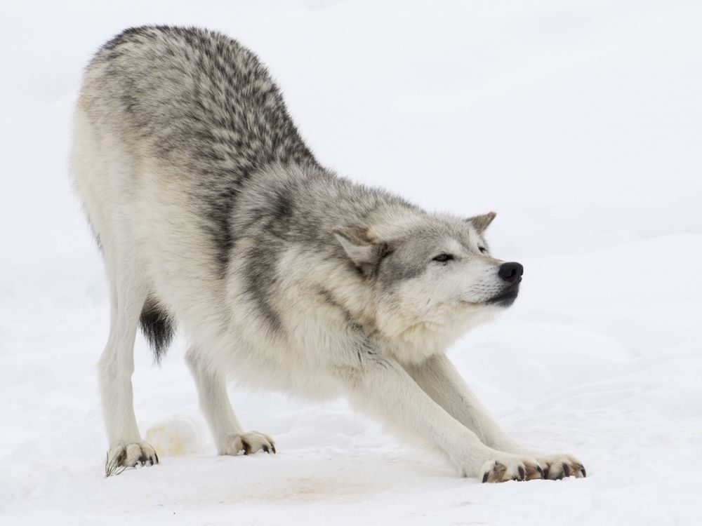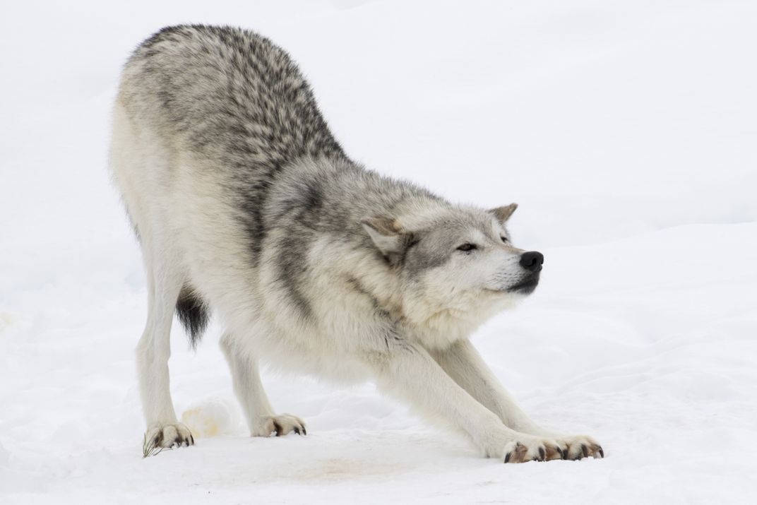 A wolf stretches out after taking a rest at the Grizzly and Wolf Discovery Center in West Yellowstone, Montana.