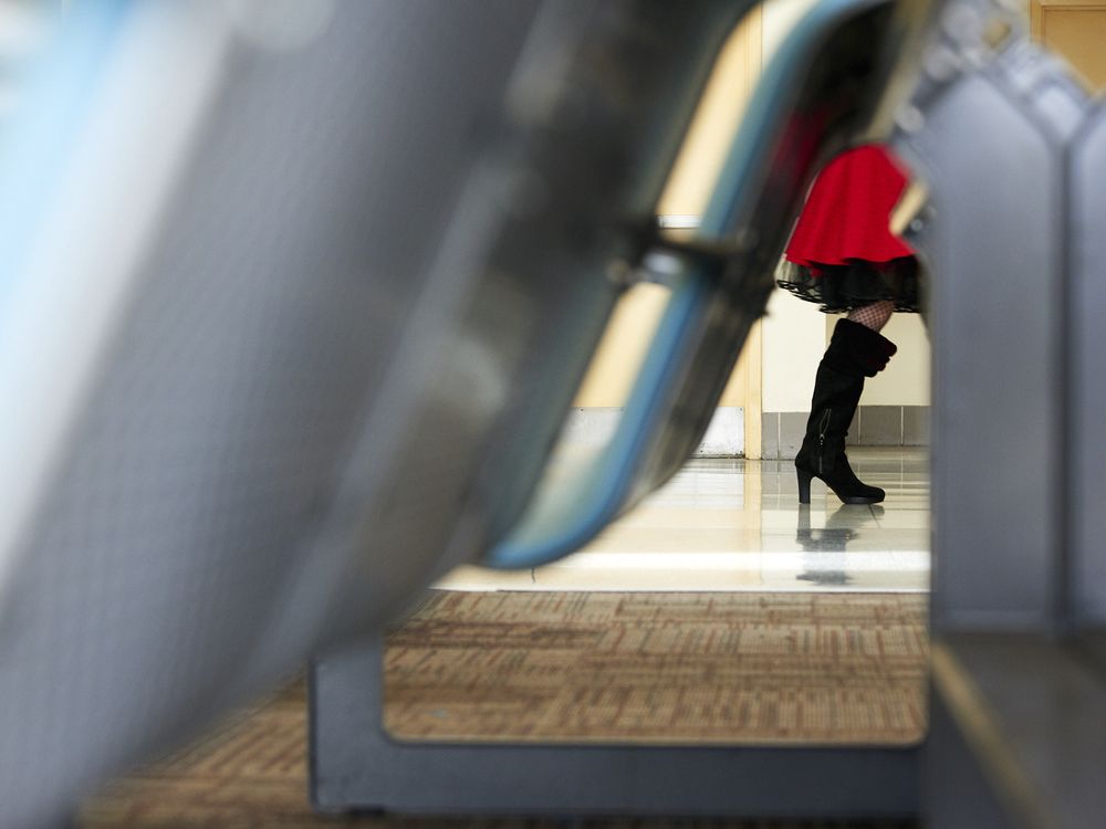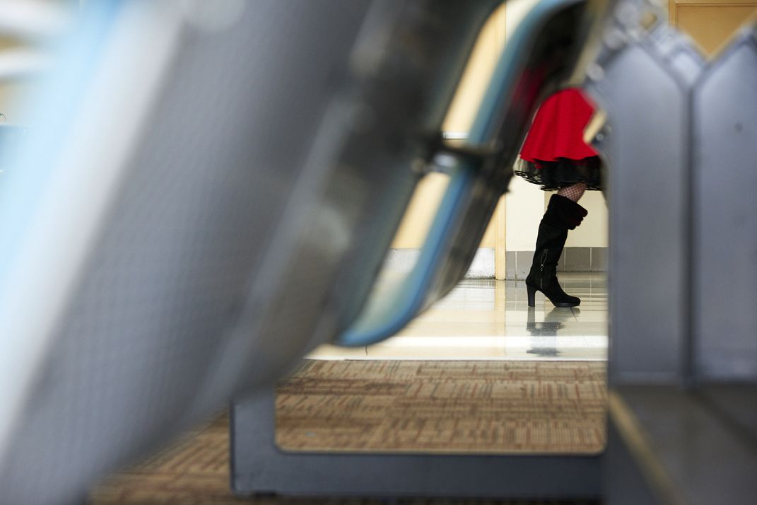 The woman in the photo was walking toward her gate while wearing red in solidarity with the worldwide strike in protest of economic inequality in the workplace.
