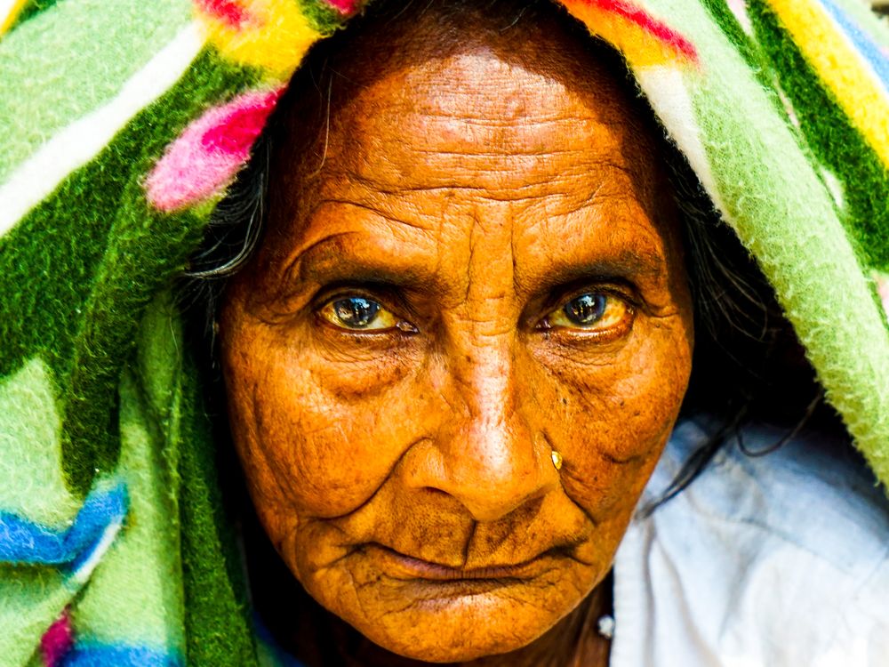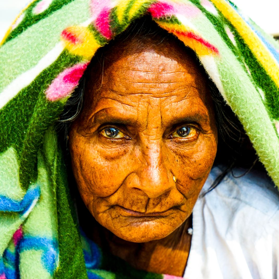 This woman was sitting at the bank of river Ganges, on what is called a "Ghaat", which is a small area designated for Hindu rituals. She was asking passers by, for monetary assistance.