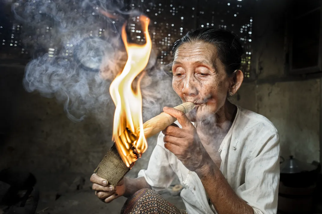 Woman smoking a big cigar made out of corn leaves and tobacco, Bagan, Myanmar, Asia