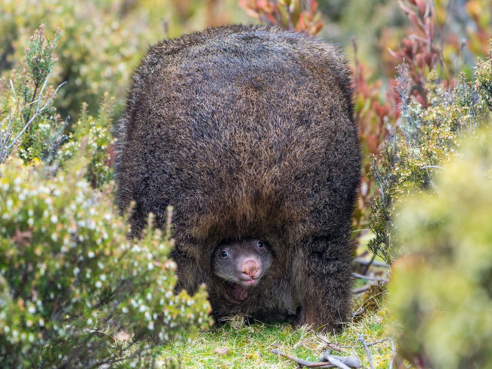 A wombat "joey" peers from its mother's reverse pouch as she grazes near a hiking trail.