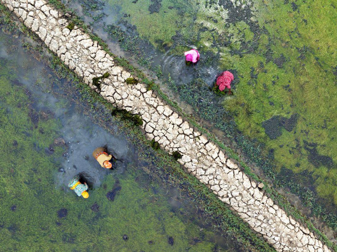 In the lush marshlands, women gather shells from the muddy waters, their vibrant clothes a stark contrast to the earthy tones surrounding them. These shells will later serve as feed for livestock, a vital part of their daily struggle for survival.