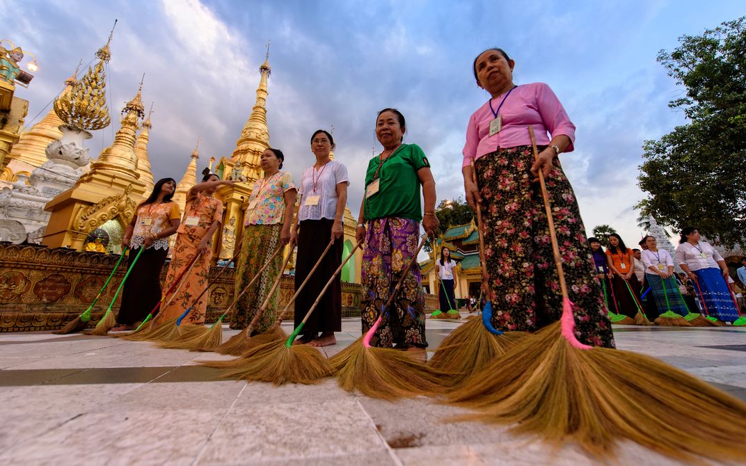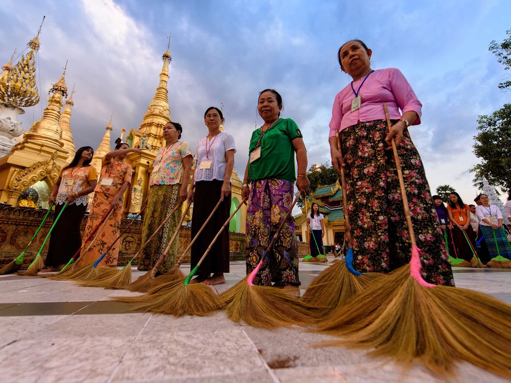 It was the firs time I visited Myanmar. When I was at Shwedagon Pagoda, I saw a lot of Burmese female sweeping the floor around the pagoda. Asking a local here, I noted that all of them are volunteers. They sweep the floor to make the experience more pleasant for the bare-foot visitors.