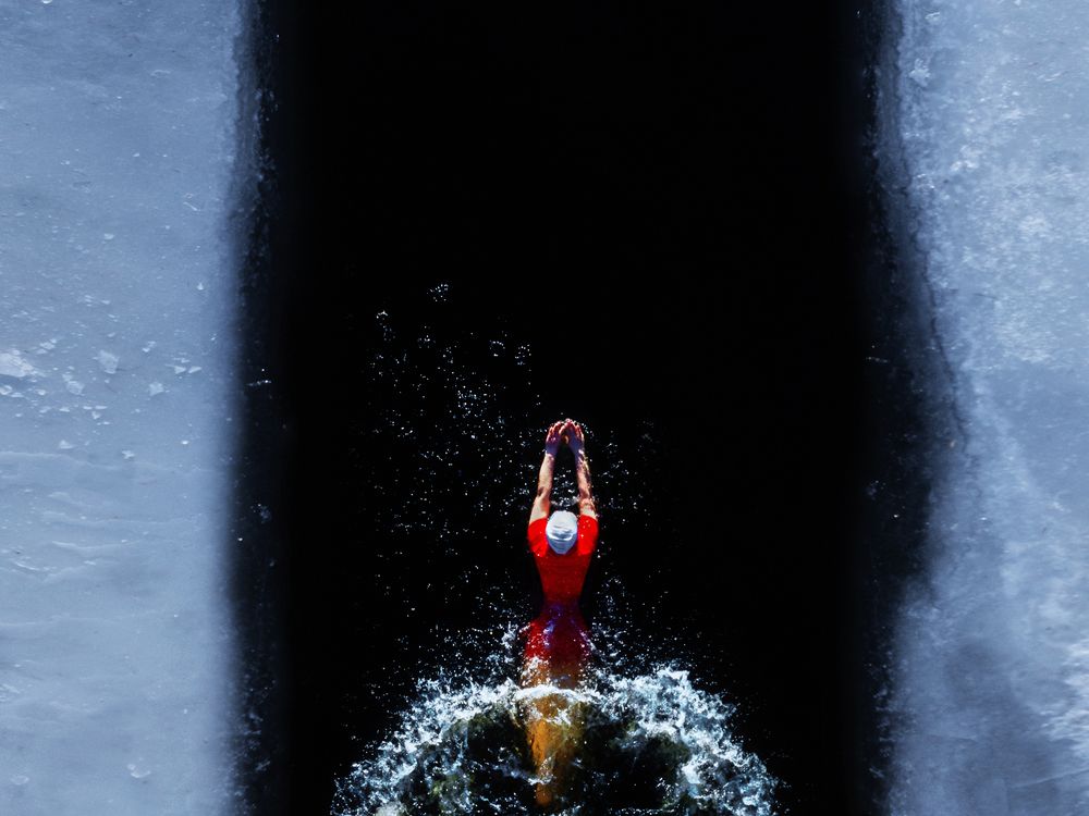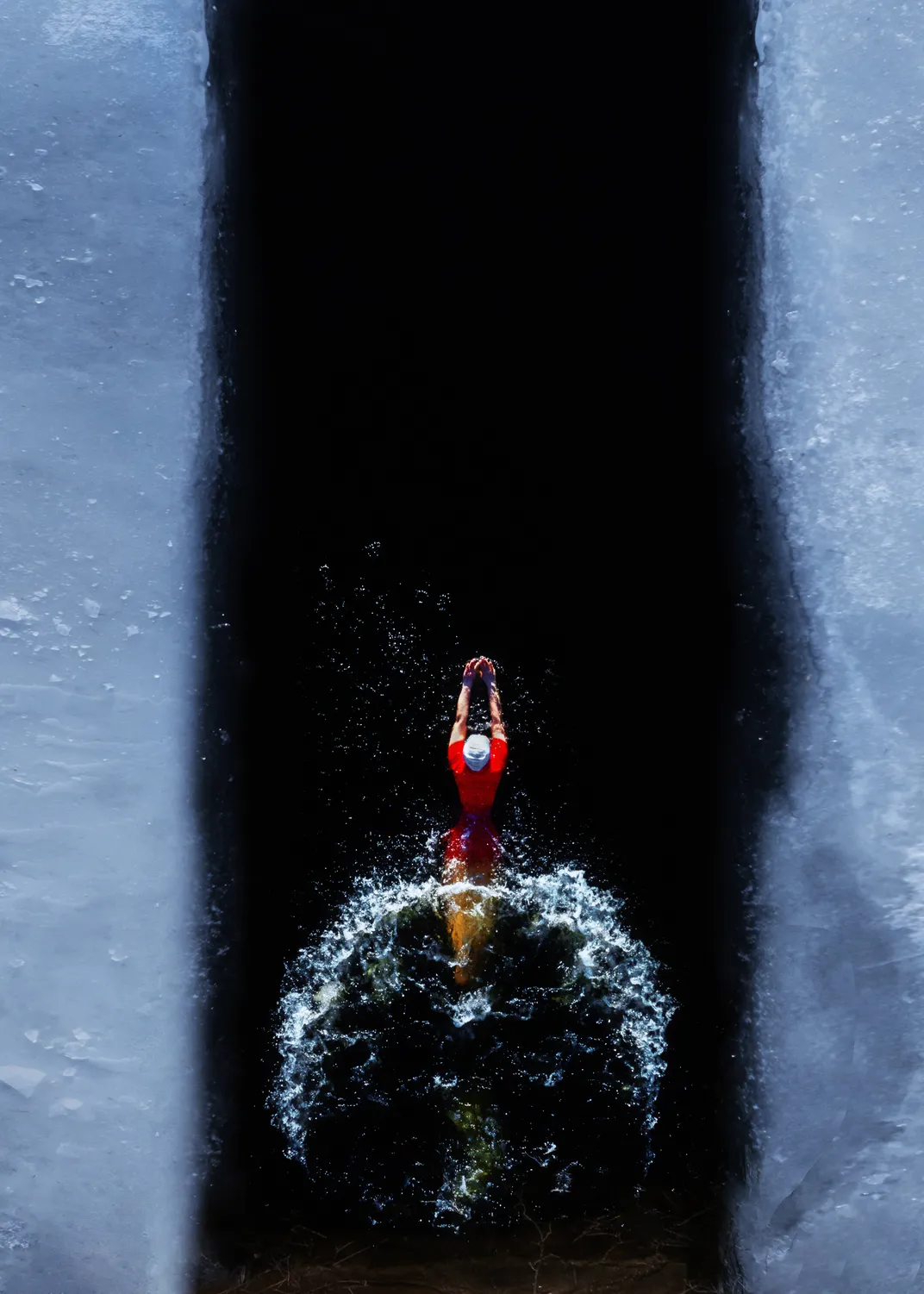 On the cold lake, a winter swimmer wearing a red swimsuit jumped into the water like a red swan
