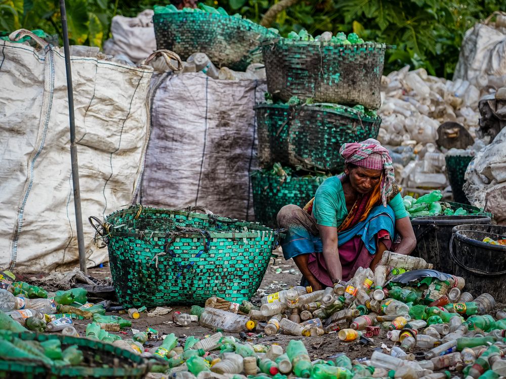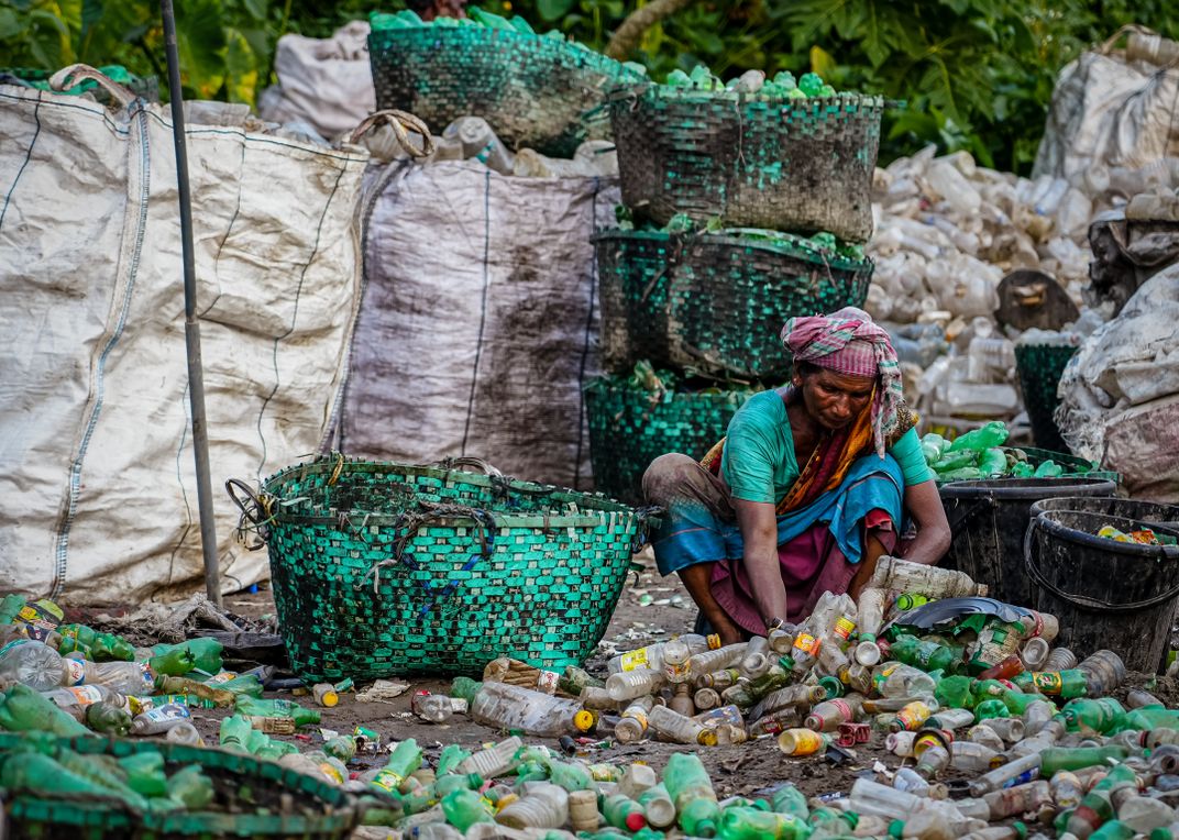 The woman is working on a plastic factory. She was separating the bottles by color. The plastic is destroying our planet. And there are some good people who are working to save us. The plastic recycling factory is a role model here. And also some people are earning by working on there.