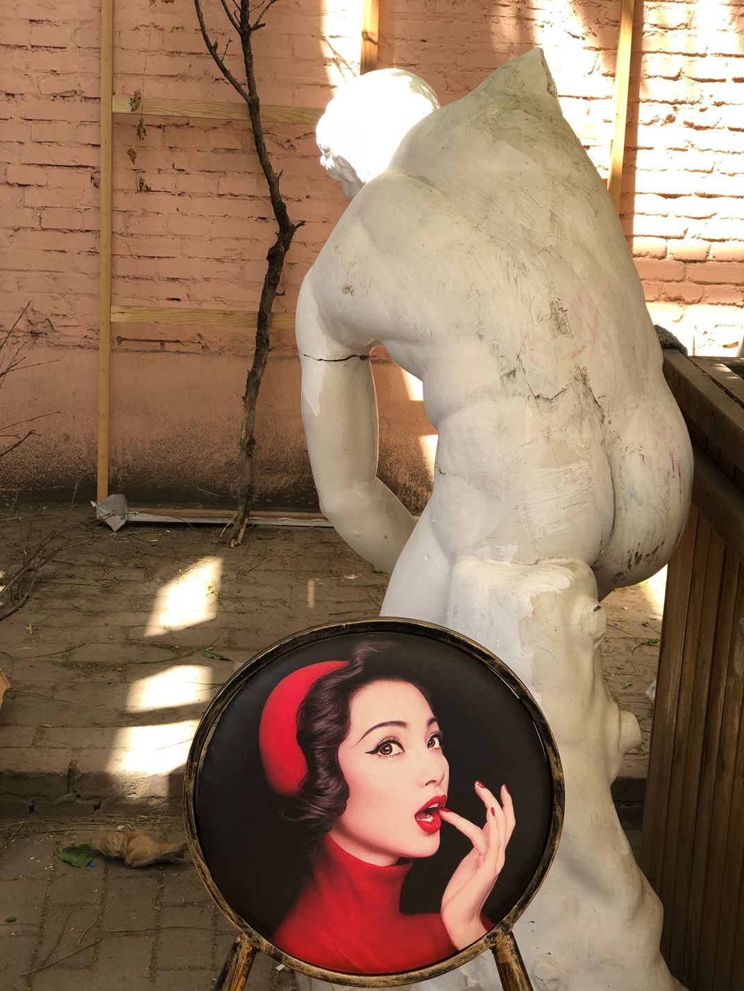 Photo of a portrait chair, naturally staring up at a statue.