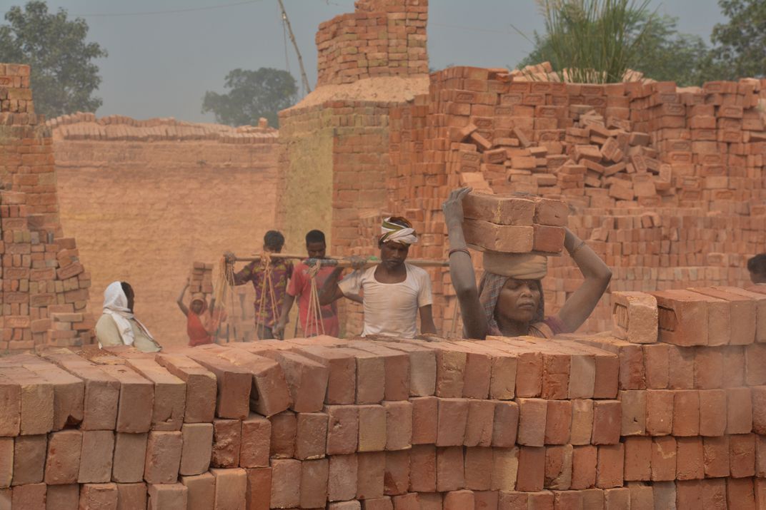 Women and men load and carry bricks from the brick furnace and stack them for transport.