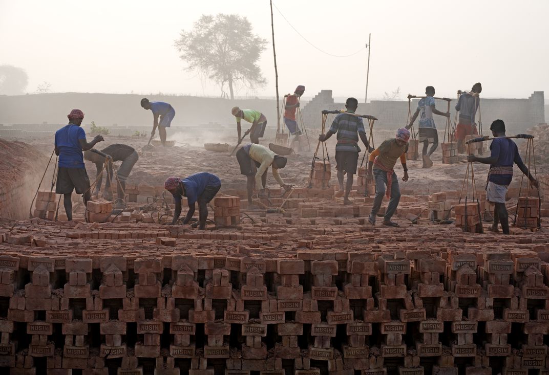 A group of brickfield workers is busy at their work on a winter morning.
