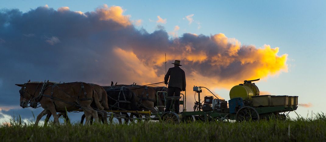 An Amish farmer ends his day planting in Amish farmlands in the springtime sundown