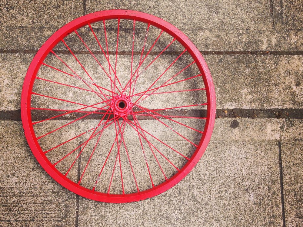 Pictured is a red bike rim that was just laying on the sidewalk. I liked the contrast of the square lines of the sidewalk next to the round shape of the rim.