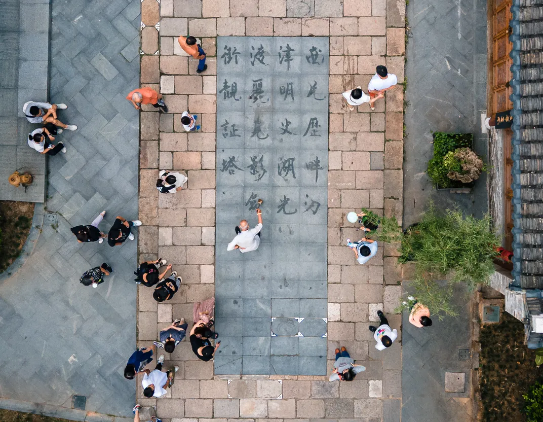 In a back alley of Zhenjiang's old town, an elderly man practices calligraphy with a large moplike brush dipped in water. Passers-by stop to watch him work and to read his poems—describing the beauty of local scenery—before their meaning evaporates.