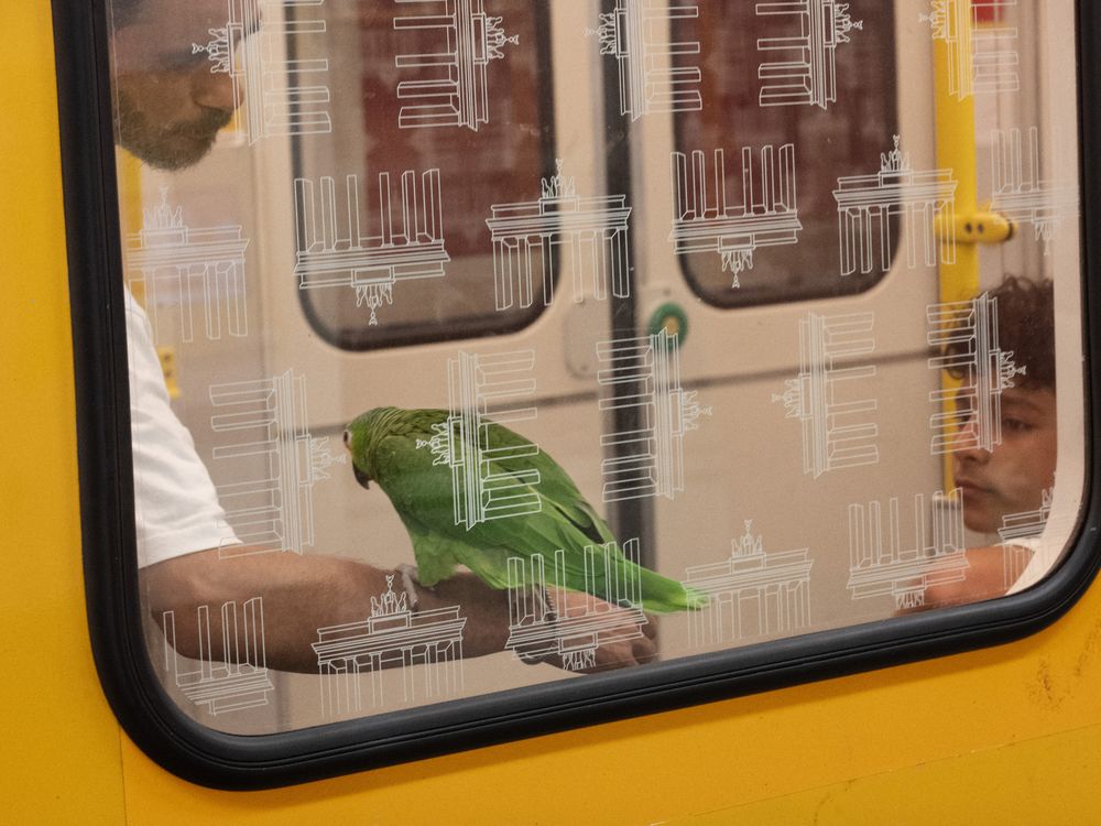Candid street shot in the undergrounds of Berlin (GER). A parrot meets the gaze of a young man. The photograph depicts an unexpected urban encounter and speaks of a quiet displacement.