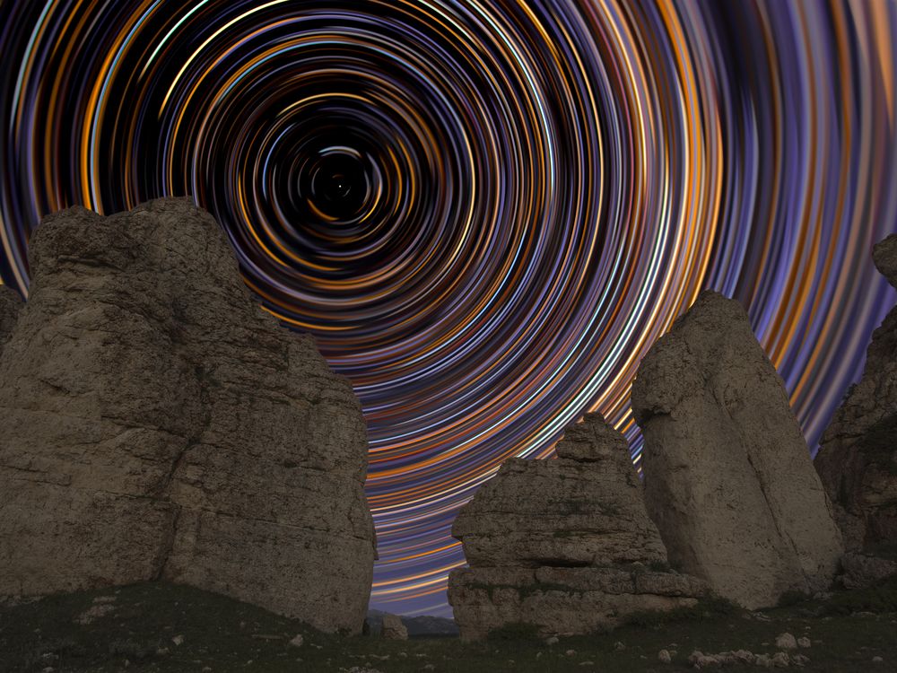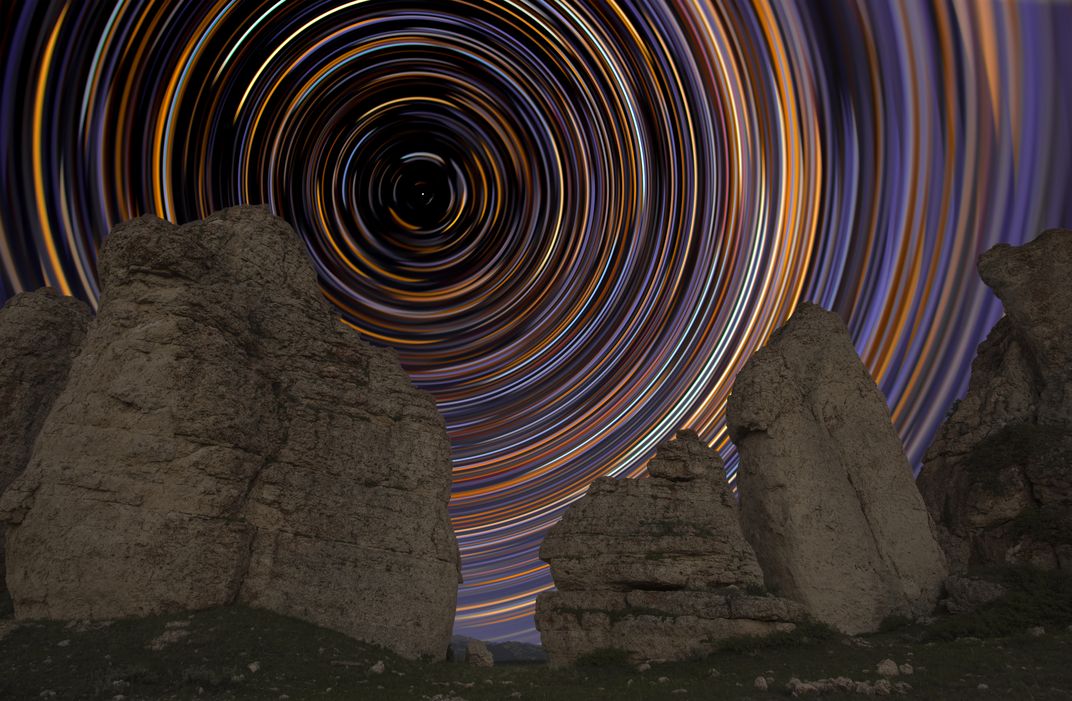 Star trails arc behind rock formations in Wyoming's Big Horn Mountains.
