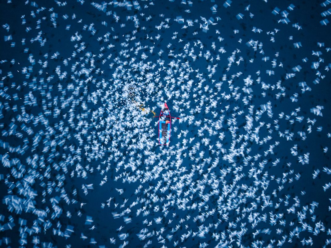This breathtaking aerial photograph captures a mesmerizing moment at Yamuna Ghat in Delhi, where thousands of seagulls create a surreal, swirling pattern around a solitary boat.