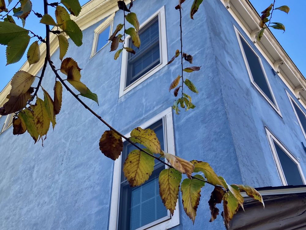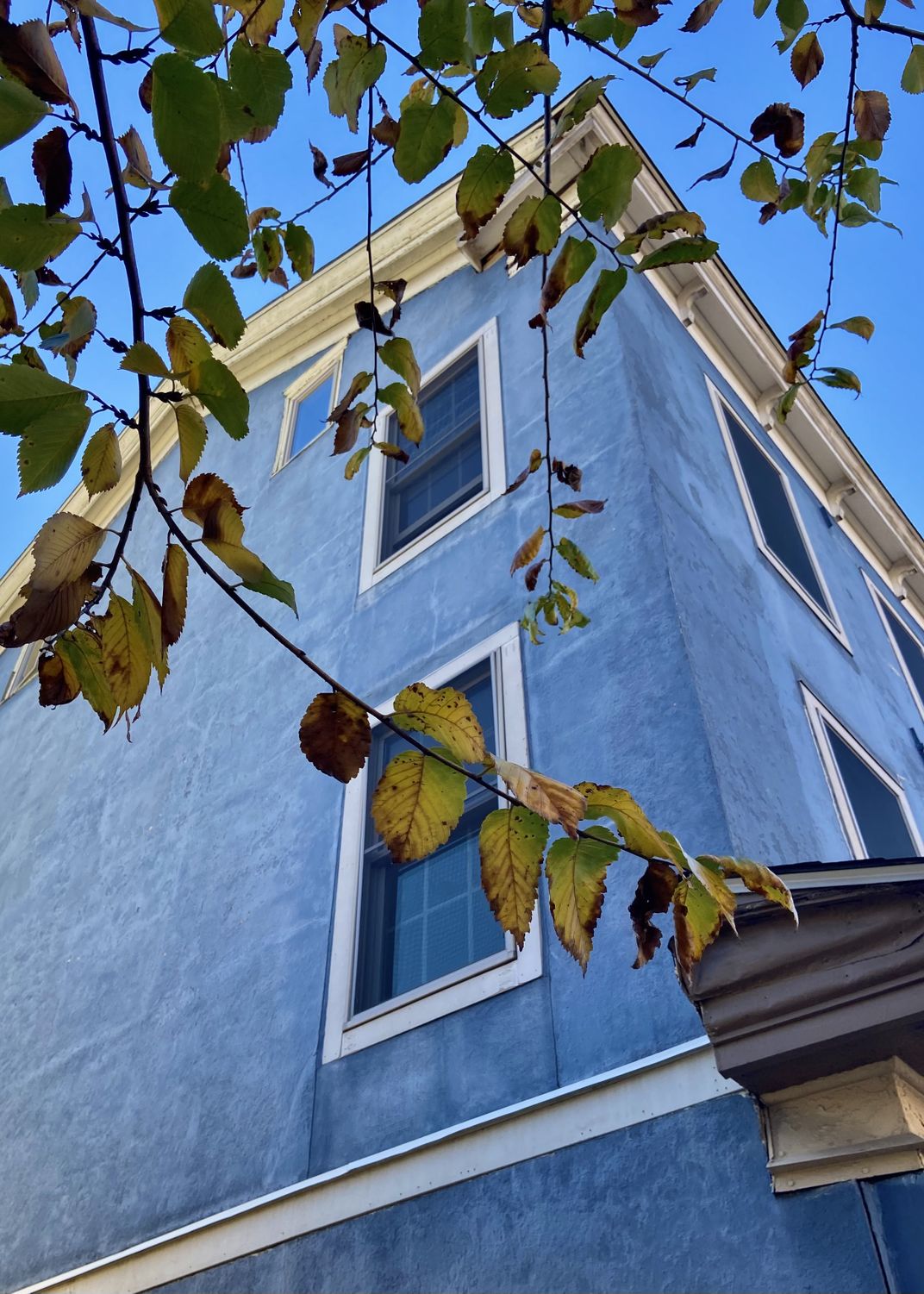 Yellow leaves across blue building and bluer sky