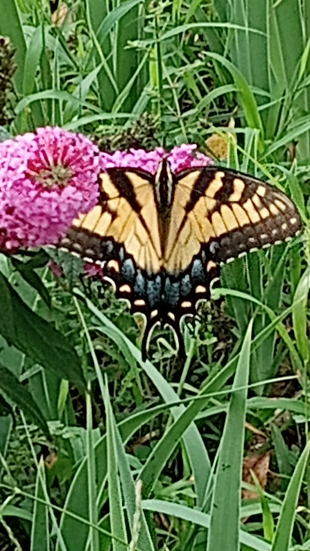 I am always on the lookout for Butterflies in my garden. I have a very lush flower garden in front of my house. The flowers attract a multitude of Butterflies and bees. One day I was out deadheading flowers and notices this Yellow Swallowtail feeding on my new purple butterfly bush flowers. It stayed there for several moments.