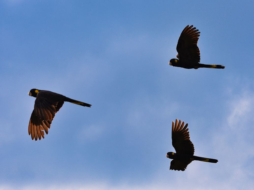 Three Yellow-tailed Black Cockatoos fly across a blue canvas. Photographing birds in rural NSW, I repeatedly heard Yellow-tails calling in the distance. The group took flight across the valley where I was lucky enough to capture a shot of these three individuals.