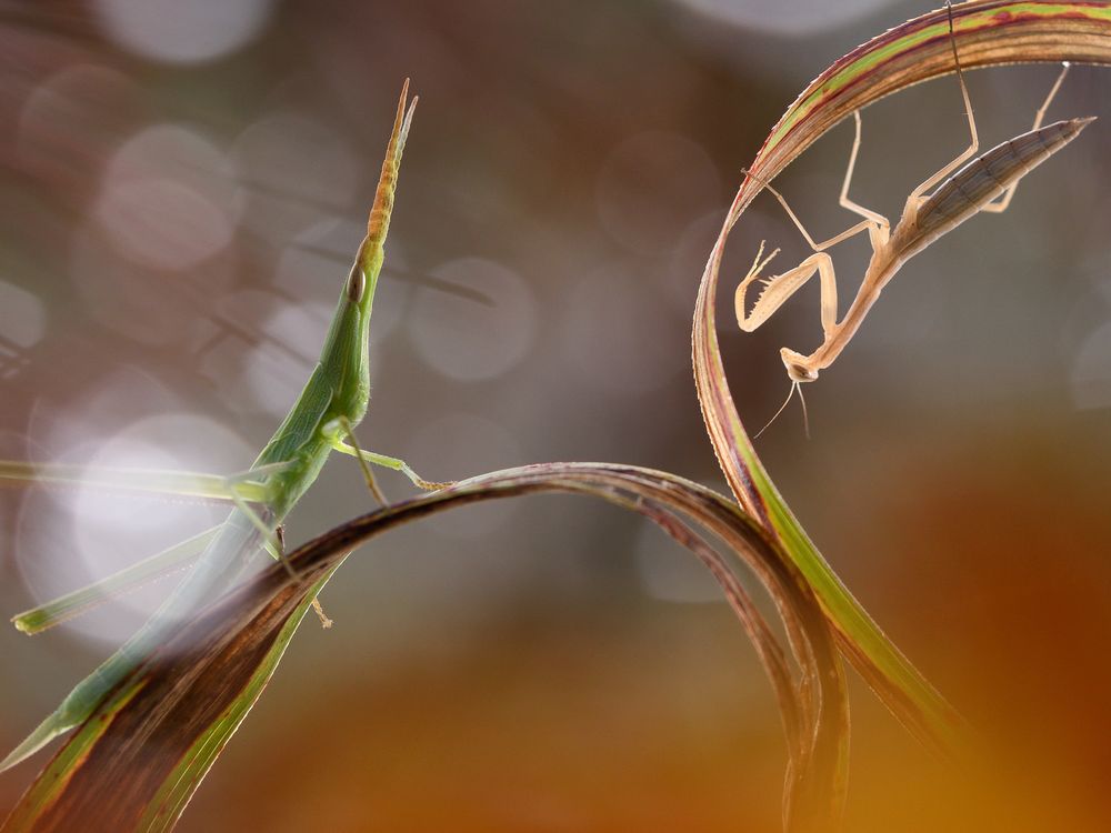 One July afternoon, this praying mantis and this cone-headed grasshopper (Acrida ungarica) shared a scene of tense calm among the vegetation. For more than an hour, predator and prey remained completely motionless, facing each other in a balanced tension and absolute stillness. Thanks to that quietude I was able to mount the camera on a tripod, set up two backlighting flashes, and take the necessary time to refine the framing until achieving the most balanced composition. Ultimately, both insects chose not to act and went their separate ways, leaving us a testimony of those fascinating moments of truce and harmony that occur in the insect world.