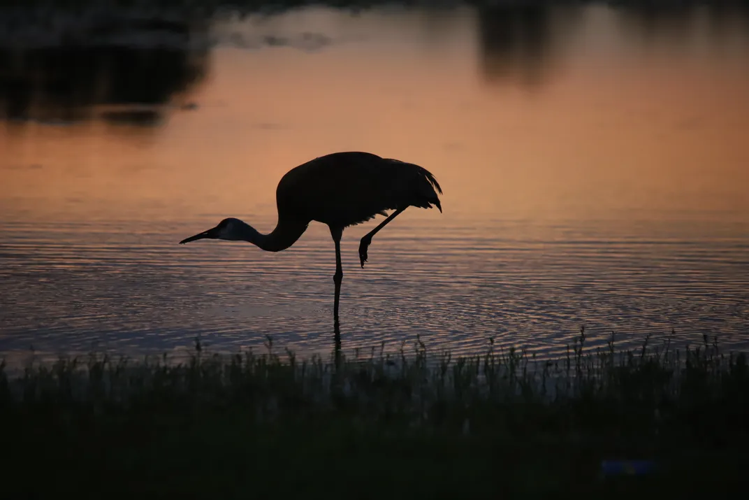 Sandhill Cranes spend days in the fields looking for scattered grain, and roost at night in nearby water. This Sandhill added some stretching to the nightly routine along the water.