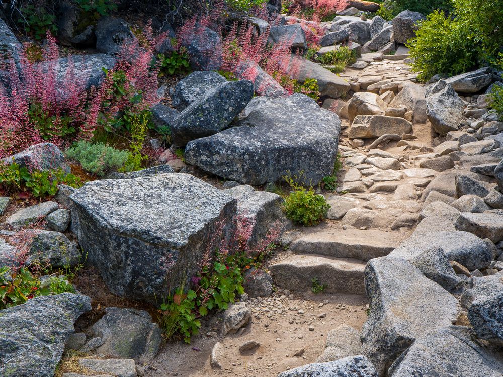 A mountain path extends from the foreground and disappears behind shrubs in the background in Yosemite National Park. The light colored stone path is lined with larger, darker rocks, green bushes and trees, as well as plants with red, cone-shaped blooms.