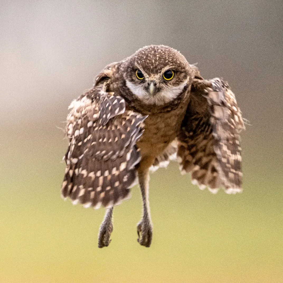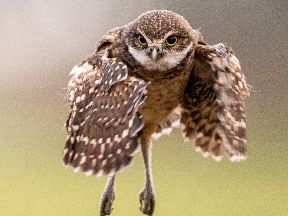 This is a young burrowing Owl. I had been watching the burrow for several days from about 25 yards. I believe this one was the oldest. This day he took off for the first time. I don't believe he saw me which is why he flew directly towards me.