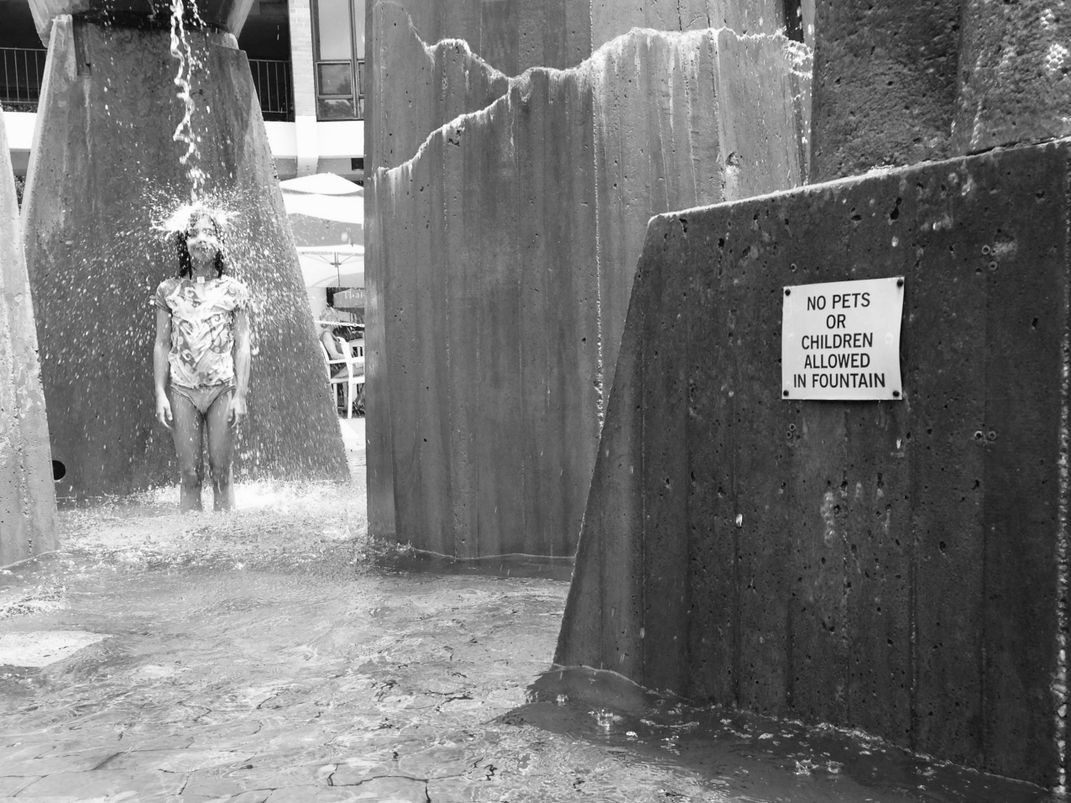 My daughter stands in a local fountain historically designed for young people to play in. Due to increased pressures associated with modern legality, the planned complex thought it necessary to hang the visible sign.