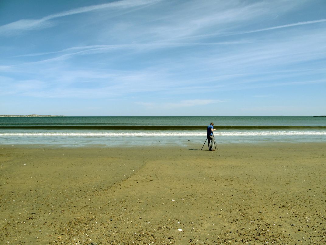Young man films the ocean