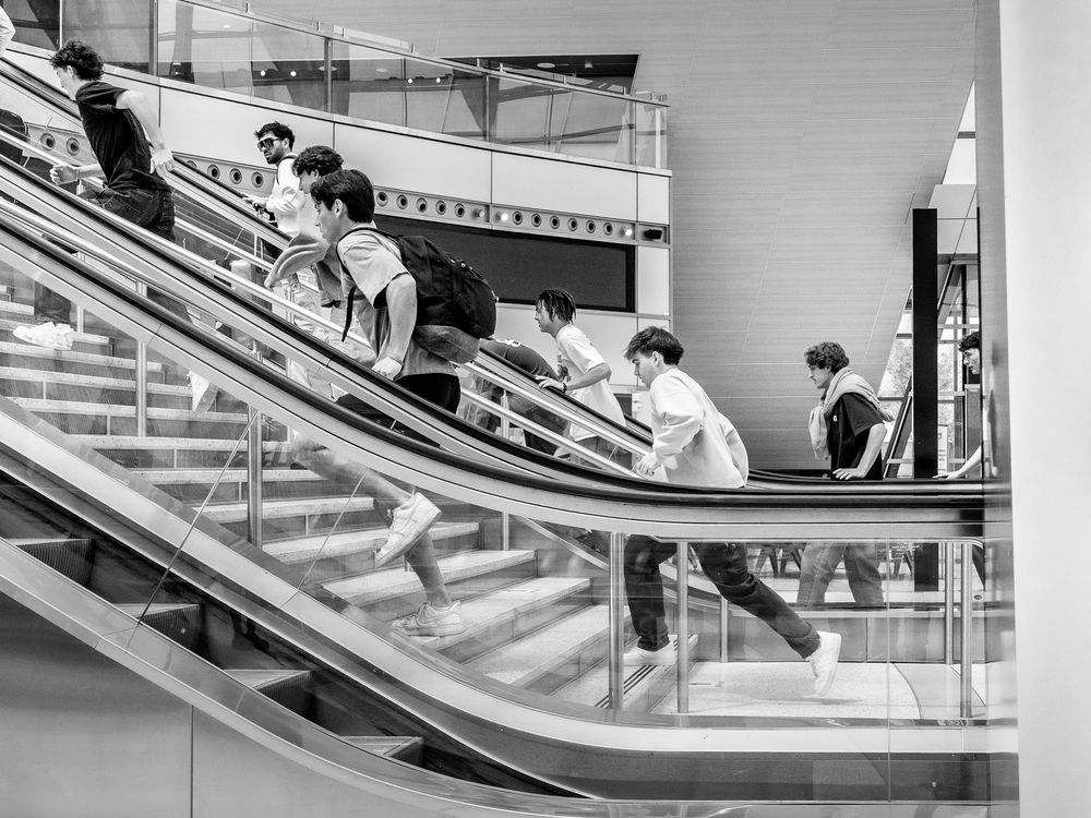 A group of young men sprint up a staircase and escalator in the Anaheim Regional Transportation Intermodal Center (ARTIC) on their way to the train platform.