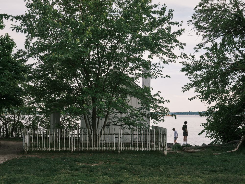 Two young men stand by the lighthouse at Jones Point park.