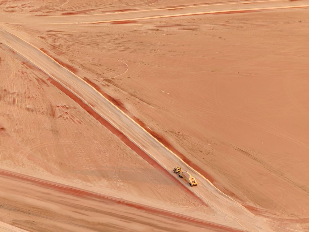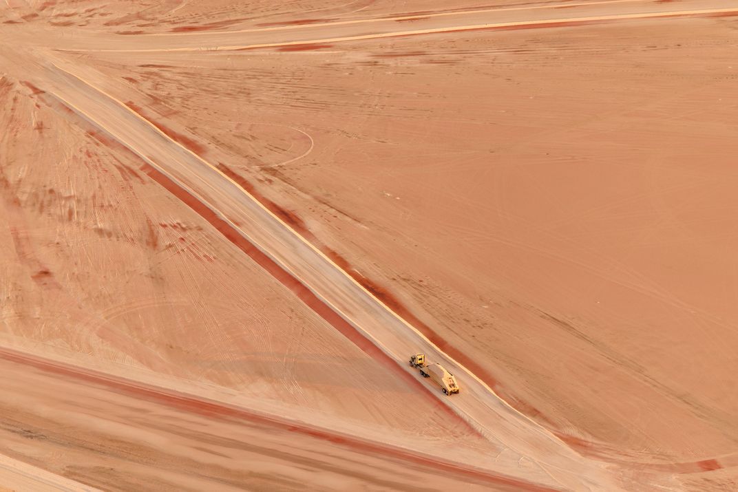 A lone haul truck follows a pale road across a wide field of salt and mineral deposits, drawing a soft “Z” across the frame. Photographed from a small aircraft, the truck’s size hints at the scale of the flattened landscape around it, marked by tire tracks and thin rust-colored stains where brine has dried