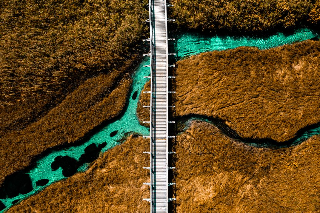 The photo shows a view of the bridge over the swamps in the Zelenci nature reserve, which owes its name (translated to green) to the color of the river. I wanted to capture the view of the bridge crossing the river perfectly in the center of the frame.