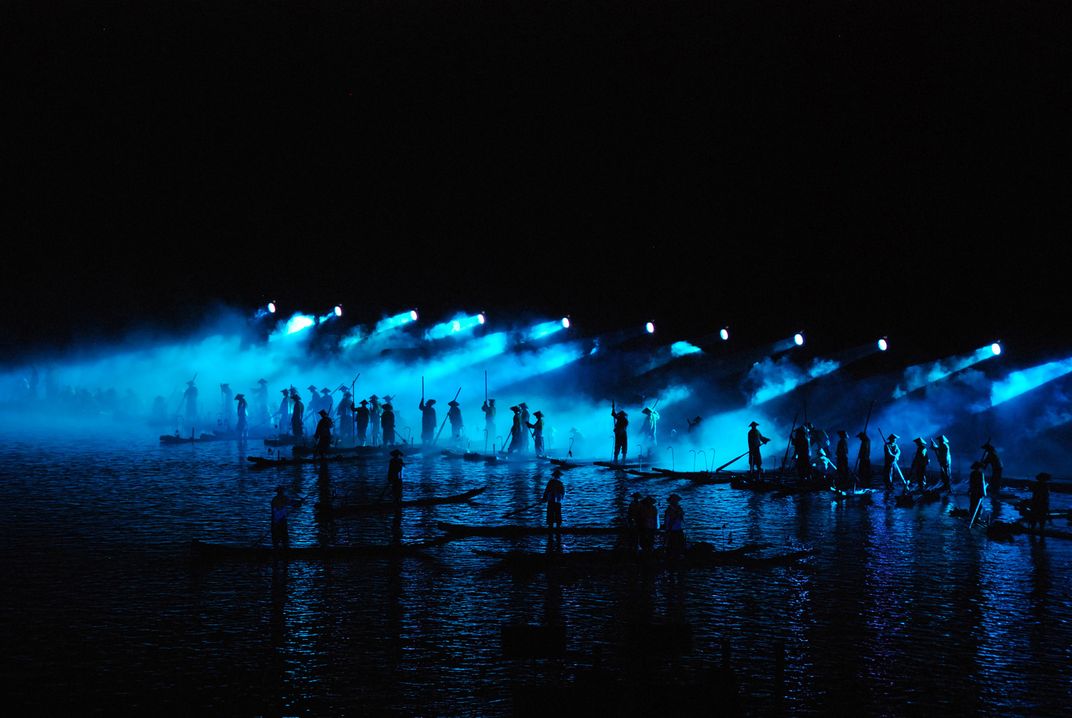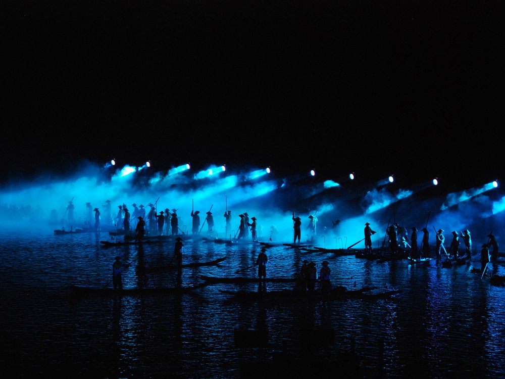 Zhang Yimou's folk musical, "Impression Liu Sanjie", is a popular show performed outdoors on the Li river with a beautiful back scenery of karst mountains and played with a cast of 600 singers and dan